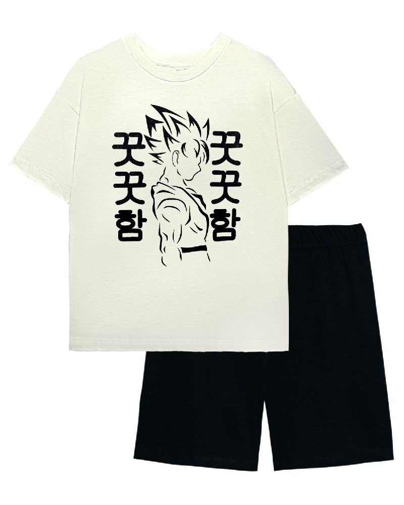 Пижама для мальчика, состоящая из футболки и шорт. Футболка свободного силуэта (оверсайз), с коротким рукавом. Горловина круглая обработана обтачкой из рибаны. Низ изделия и рукава обработан швом вподгибку. На полочке принт Шелкография. Надпись переводится как "Сила духа". Шорты прямого силуэта, из однотонного полотна. Пояс цельнокроенный, с эластичной тесьмой внутри. Низ изделия обработан швом вподгибку.