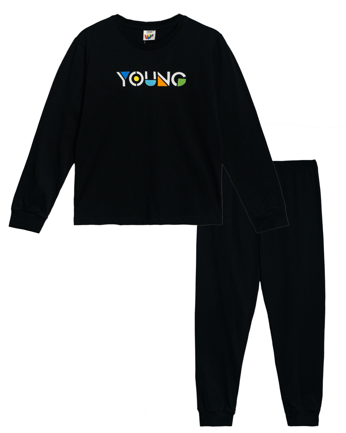 Пижама для мальчика, состоящая из джемпера и брюк. Джемпер прямого силуэта, с втачным длинным рукавом. Горловина круглая обработана обтачкой из рибаны. По низу рукавов манжеты из рибаны. Низ изделия обработан швом вподгибку. На полочке принт Шелкография. Надпись переводится как "Молодой". Брюки прямого силуэта, из однотонного полотна. Пояс цельнокроенный, с эластичной тесьмой внутри. По низу изделия манжеты из рибаны.