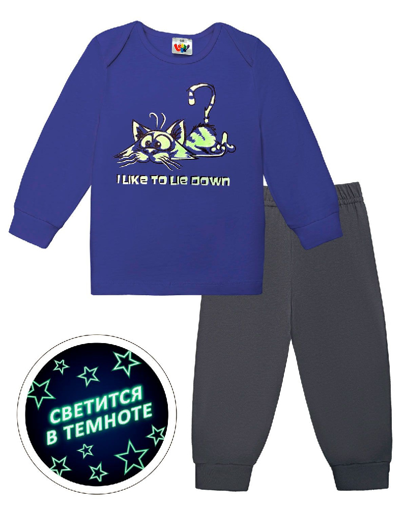 Пижама детская, состоящая из джемпера и брюк. Джемпер прямого силуэта, с втачным длинным рукавом. Горловина круглая, обработана бейкой из рибаны. Спинка, в плечевых швах, переходит на полочку с нахлестом 5см, образуя фигурное закругление к точке основания шеи, по край обработан бейкой из рибаны. По низу рукавов манжеты из рибаны. Низ изделия обработан швом вподгибку. На полочке принт Шелкография с флуоресцентной краской. ПРИНТ СВЕТИТСЯ В ТЕМНОТЕ. Надпись переводится как "Я люблю лежать". Брюки прямого силуэта, из однотонного полотна. Пояс цельнокроенный, с эластичной тесьмой внутри. По низу изделия манжеты из рибаны.