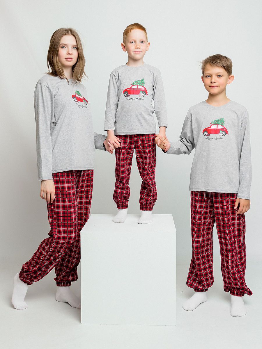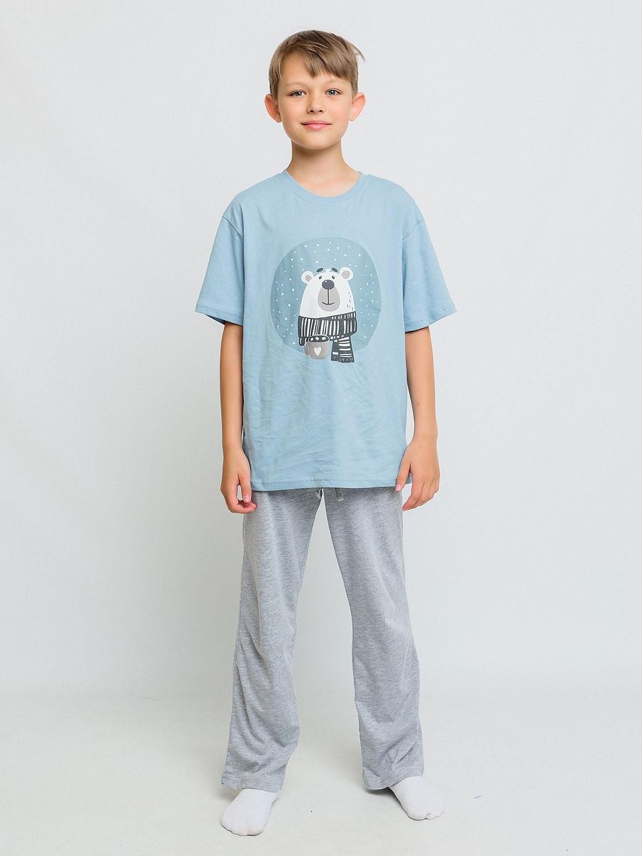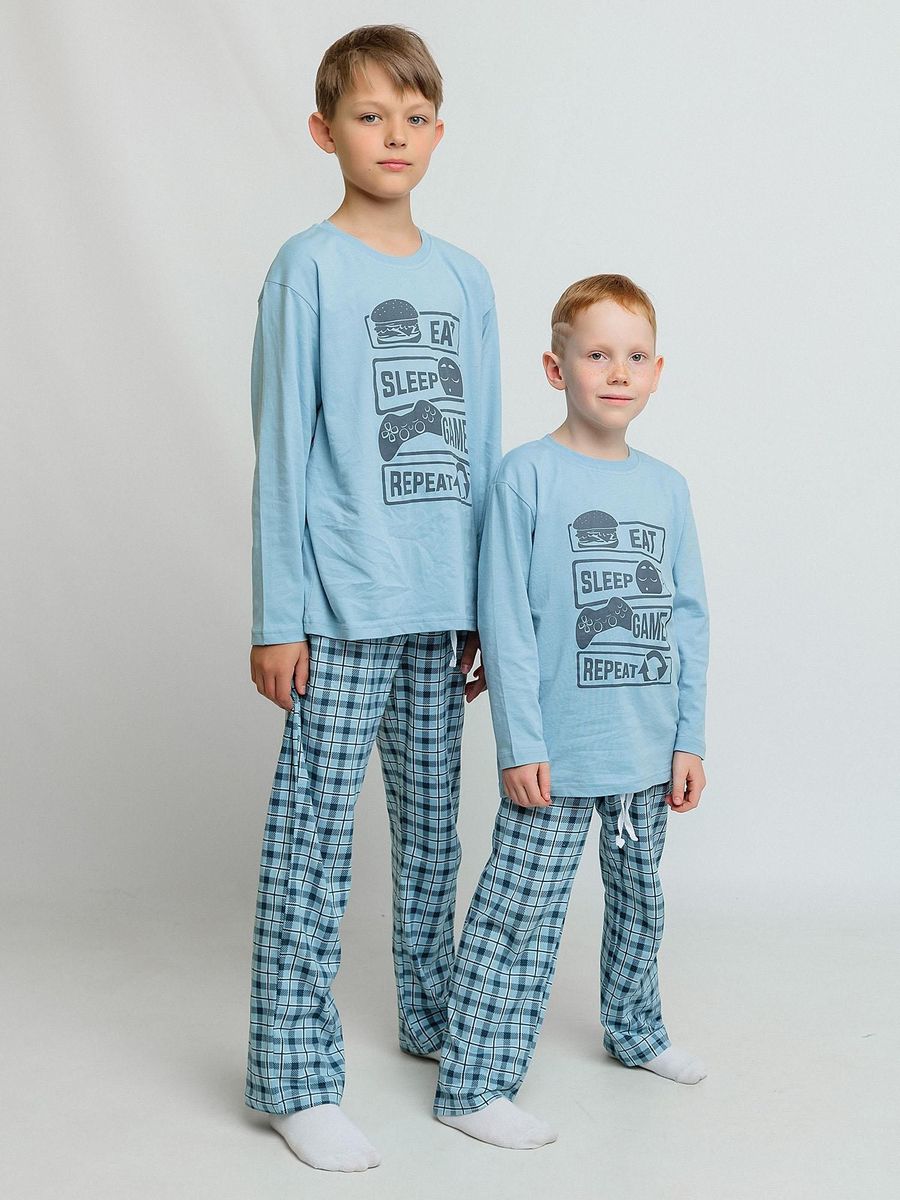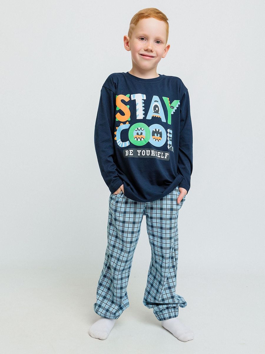 Пижама для мальчика, состоящая из джемпера и брюк. Джемпер прямого силуэта с втачным длинным рукавом. Горловина круглая, окантована рибаной. Плечо с запахом, край запаха обработан рибаной. По низу рукавов манжеты из рибаны. Низ изделия обработан швом вподгибку. На полочке принт ШЕЛКОГРАФИЯ. Брюки прямого кроя из набивного полотна. Пояс цельнокроенный, с эластичной тесьмой внутри. По низу изделия манжеты из рибаны.