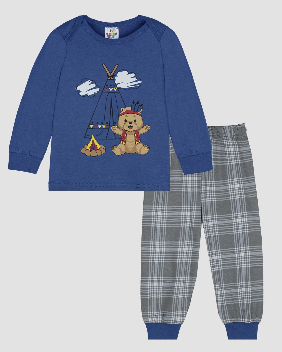Пижама для мальчика, состоящая из джемпера и брюк. Джемпер прямого силуэта с втачным длинным рукавом. Горловина круглая, окантована рибаной. Плечо с запахом, край запаха обработан рибаной. По низу рукавов манжеты из рибаны. Низ изделия обработан швом вподгибку. На полочке принт ШЕЛКОГРАФИЯ. Брюки прямого кроя из однотонного полотна. Пояс цельнокроенный, с эластичной тесьмой внутри. По низу изделия манжеты из рибаны.