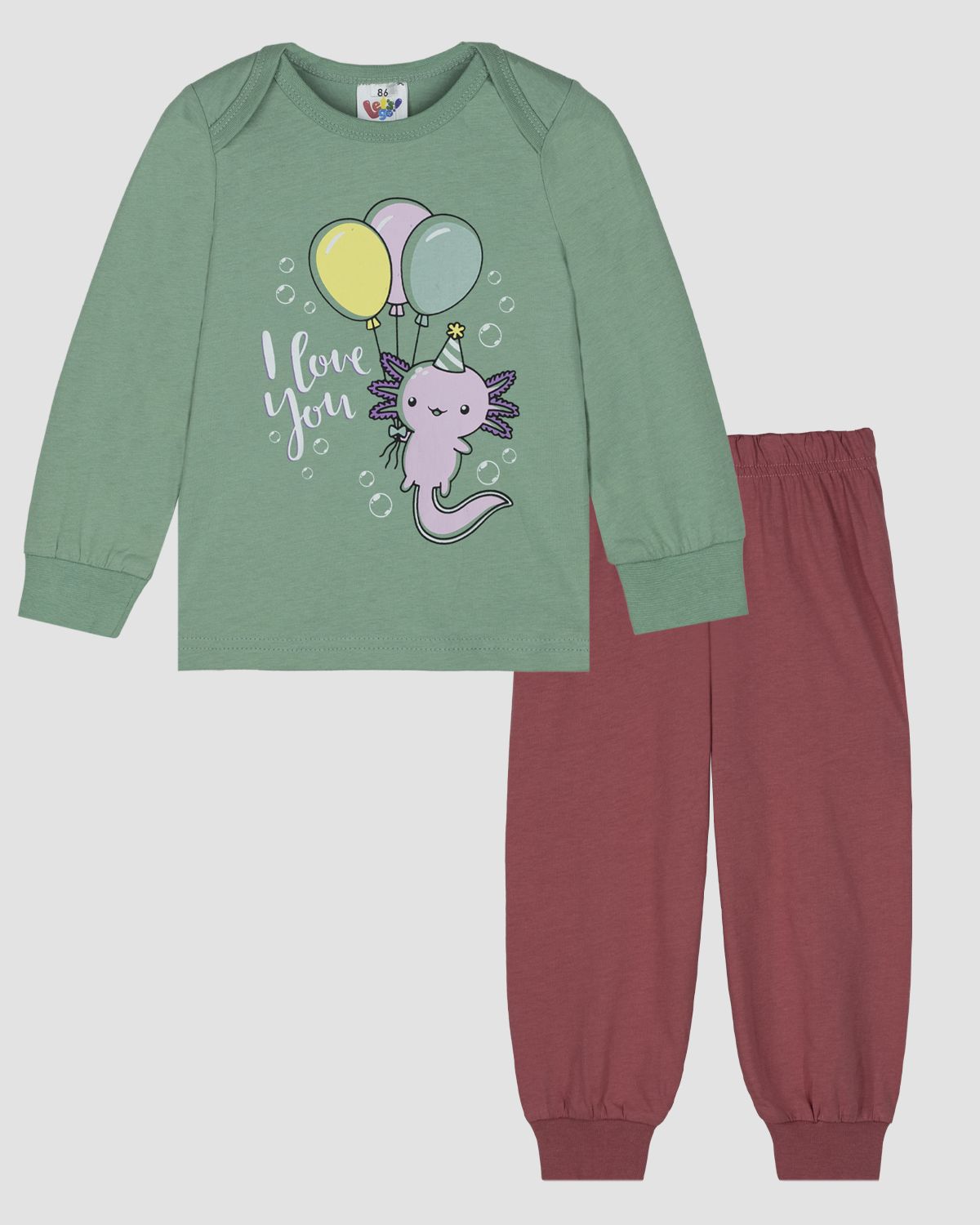 Пижама для девочки, состоящая из джемпера и брюк. Джемпер прямого силуэта с втачным длинным рукавом. Горловина круглая, окантована рибаной. Плечо с запахом, край запаха обработан рибаной. По низу рукавов манжеты из рибаны. Низ изделия обработан швом вподгибку. На полочке принт ШЕЛКОГРАФИЯ. Надпись переводится как "Я люблю тебя". Брюки прямого кроя из однотонного полотна. Пояс цельнокроенный, с эластичной тесьмой внутри. По низу изделия манжеты из рибаны.