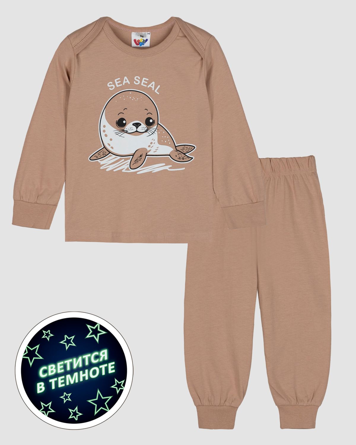 Пижама для мальчика, состоящая из джемпера и брюк. Джемпер прямого силуэта с втачным длинным рукавом. Горловина круглая, окантована рибаной. Плечо с запахом, край запаха обработан рибаной. По низу рукавов манжеты из рибаны. Низ изделия обработан швом вподгибку. На полочке принт ШЕЛКОГРАФИЯ С ФЛУОРЕСЦЕНТНОЙ КРАСКОЙ. Надпись переводится как "Морской тюлень". Брюки прямого кроя из однотонного полотна. Пояс цельнокроенный, с эластичной тесьмой внутри. По низу изделия манжеты из рибаны. ПРИНТ СВЕТИТСЯ В ТЕМНОТЕ.