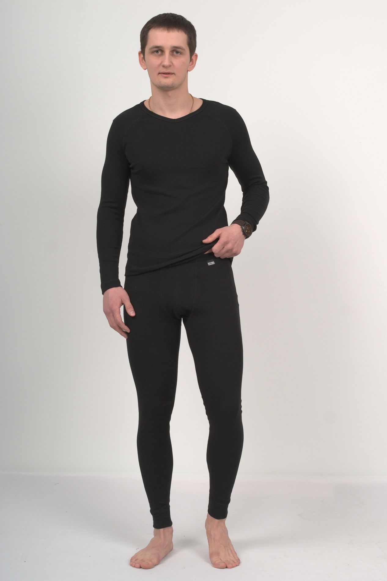 Кальсоны для мальчика из рибаны с начёсом. На передней части - гульфик. Срез пояса обработан подгибом с эластичной тесьмой, срезы ног обработаны манжетами из рибаны. Соединительные швы отстрочены плоским швом