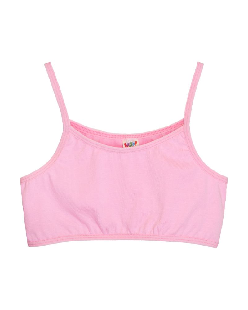Майка для девочки на бретелях (бразильетка) из гладкокрашенной кулирки. Линия декольте и проймы окантованы эластичной тесьмой.