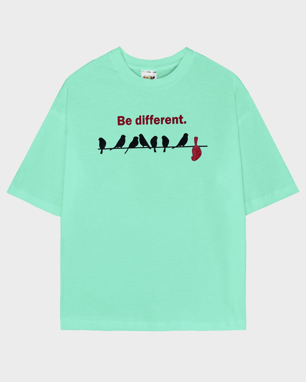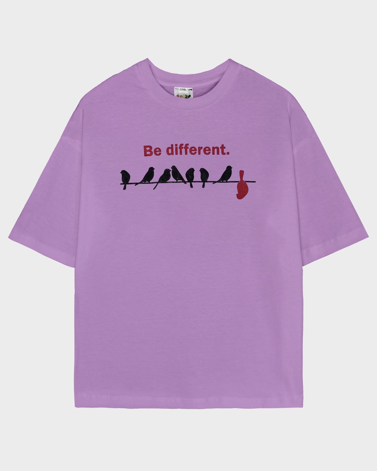 Футболка для девочки свободного силуэта (оверсайз) с коротким рукавом. Горловина круглая, обработана обтачкой из рибаны. Низ изделия и рукава обработаны швом вподгибку. На полочке принт Шелкография. Надпись переводится как "Будь другой".