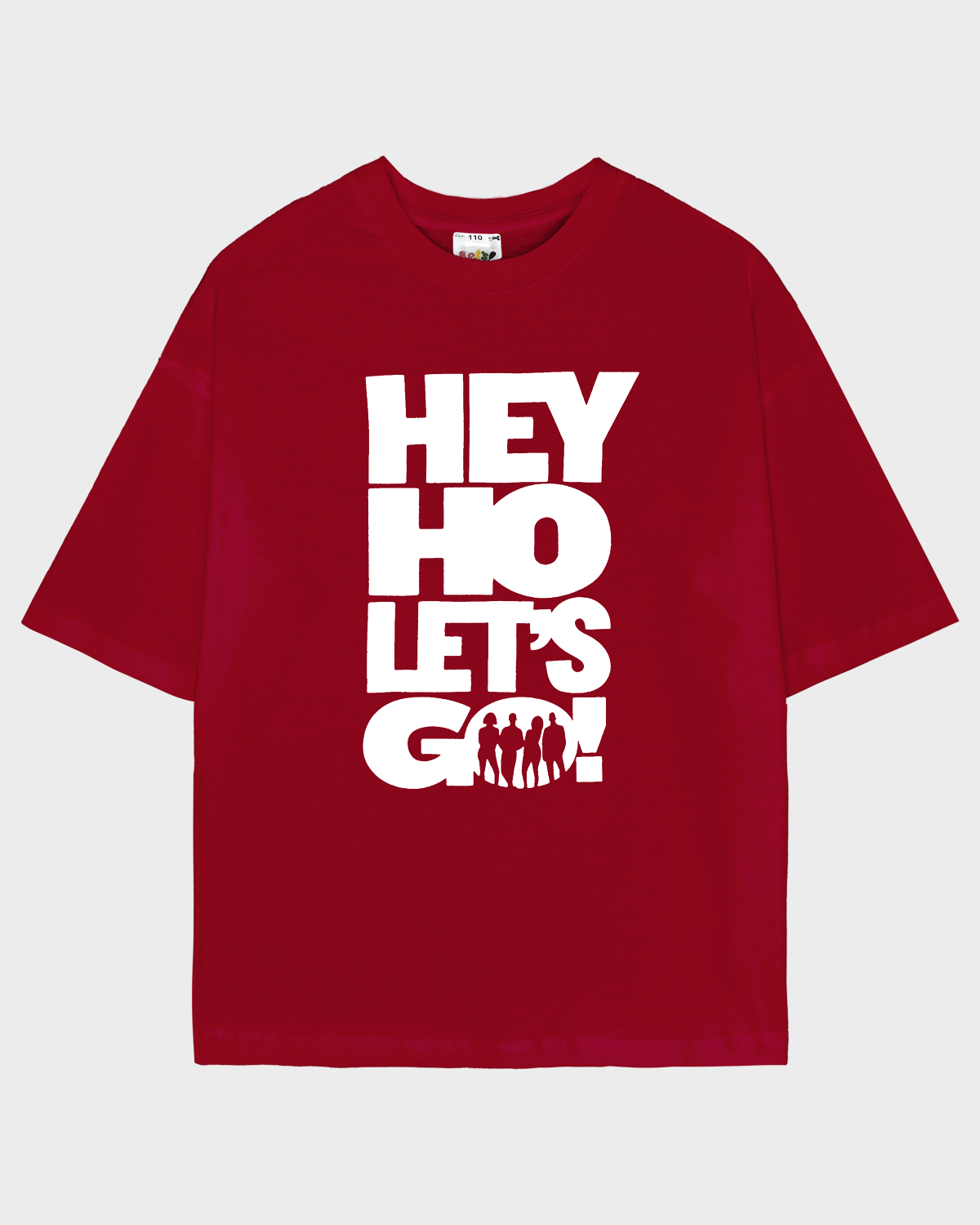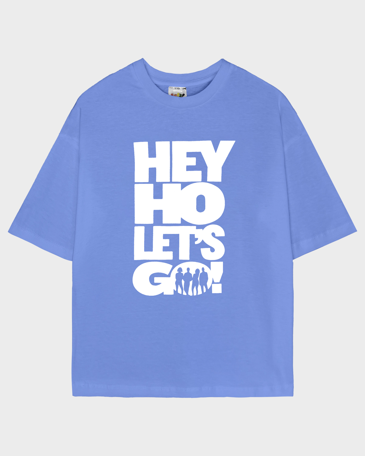 Футболка детская свободного силуэта (оверсайз) с коротким рукавом. Горловина круглая, обработана обтачкой из рибаны. Низ изделия и рукава обработаны швом вподгибку. На полочке принт Шелкография. Надпись переводится как "Хей хо вперед!".