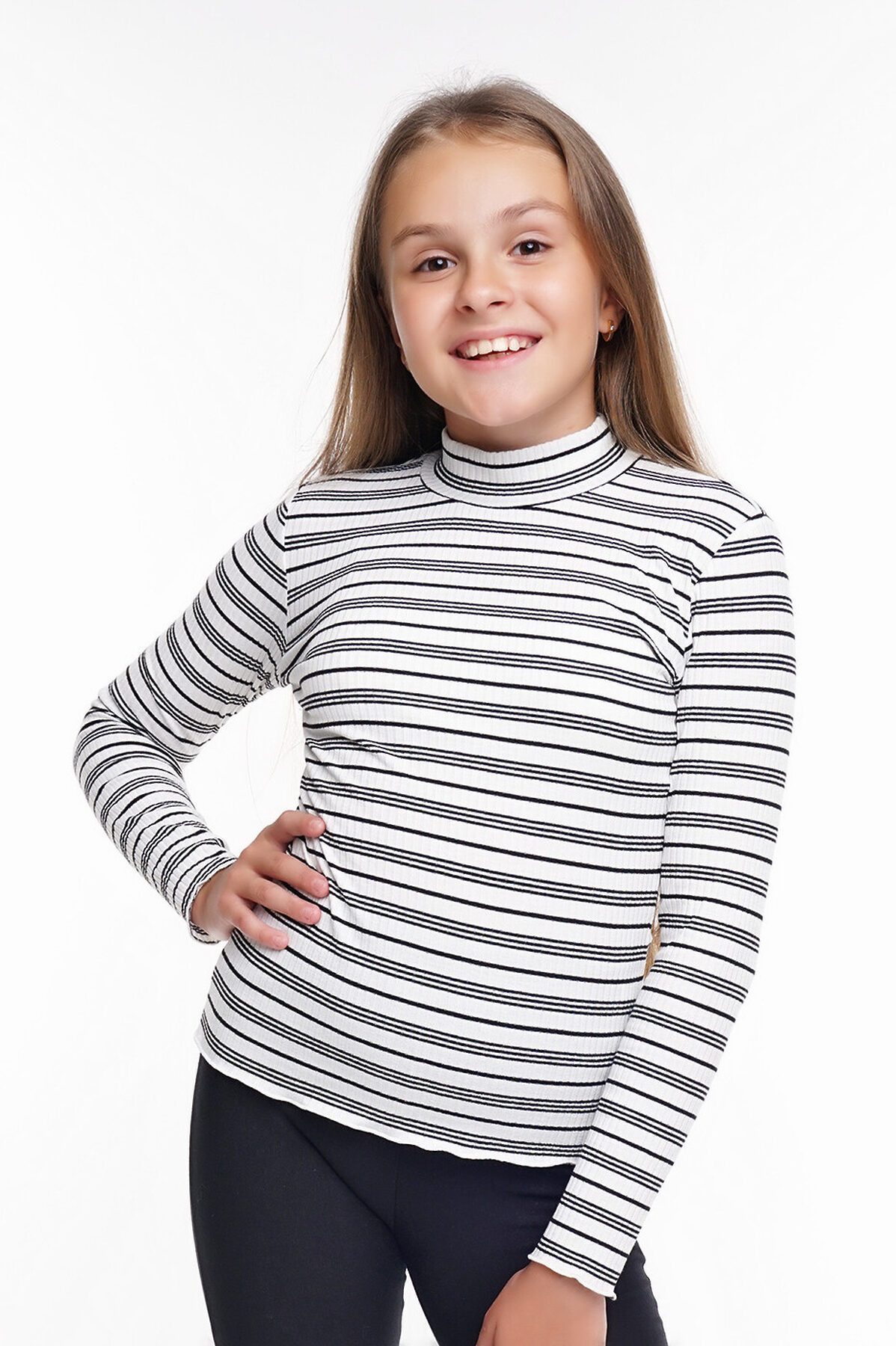 Прекрасный вариант на каждый день. Полосатая водолазка с высоким воротом. Модная изюминка заключается в волнистой обработке края рукава, ворота и низа изделия.