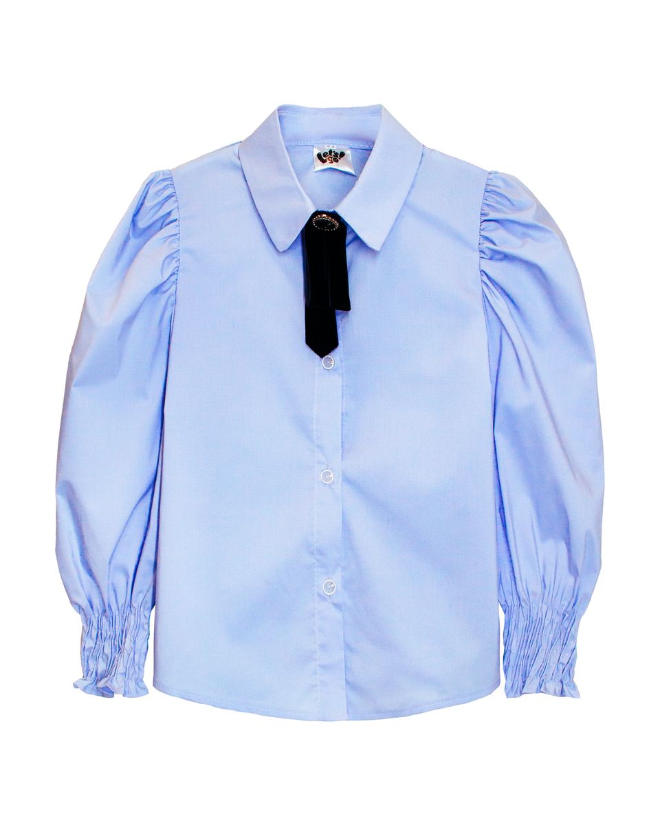 Джемпер для девочки прямого силуэта, с длинным рукавом. Горловина круглая обработана классическим  воротником-стойкой с застёжкой на одну пуговицу и декоративным элементом (съемная брошь). Длинный рукав-фонарик, манжеты обработаны эластичной нитью  со сборкой. Низ изделия обработан в подгибку.