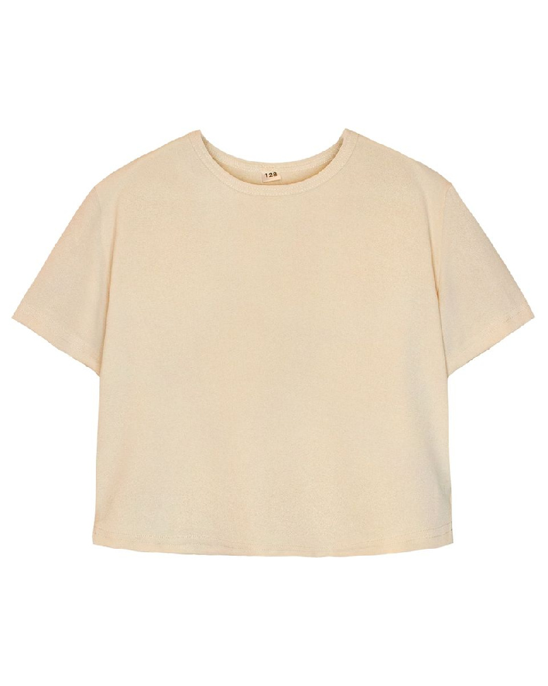 Футболка укороченная для девочки. Свободный прямой крой. Модель с круглым вырезом и окантовкой из основного полотна.