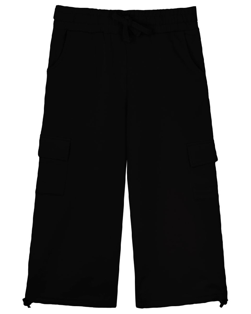 Брюки детские прямого силуэта с накладными карманами. Отрезной пояс, из основного полотна, с эластичной тесьмой внутри. По поясу брюк вставлен плоский утягивающий шнурок. Длина шнурка = длина пояса + 45 см для возможности завязывания. На передней половинке брюк карманы с отрезным бочком. На боковом срезе брюк располагается накладной карман с клапаном и встречной складкой на кармане, из основного полотна. Карман располагается с 2-х сторон симметрично. Низ изделия обработан швом в подгибку. В боковом шве петелька из основного полотна, в которую продевается кулиса.