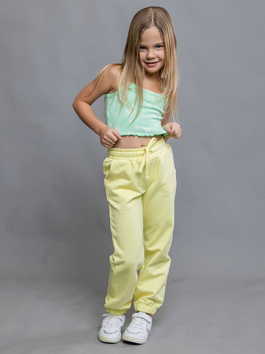 Брюки детские из полотна холодок-сетка прямого силуэта. Пояс отрезной, выполнен из основного полотна, с эластичной тесьмой внутри. Внутри пояса брюк вставлен плоский утягивающий шнурок с пластиковым наконечником. На уровне бедер выполнены карманы с прорезной листочкой, вход в карман с замком. По низу изделия цельнокроенные манжеты на резинки.