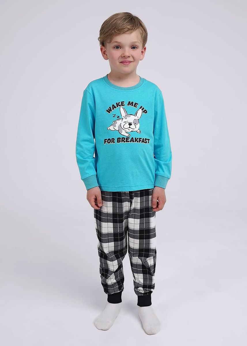 Брюки детские прямого силуэта. Пояс отрезной, выполнен из основного полотна, в цвет изделия, с эластичной тесьмой внутри, тесьма закреплена в шов. На изделии выполнены карманы с отрезным бочком и отлетной мешковиной, вход в карман обтачной. Накладной карман с клапаном располагается симметрично на боковых швах, из основного полотна. На клапанеправого кармана шеврон. По низу изделия цельнокроенные манжеты с резинкой внутри.