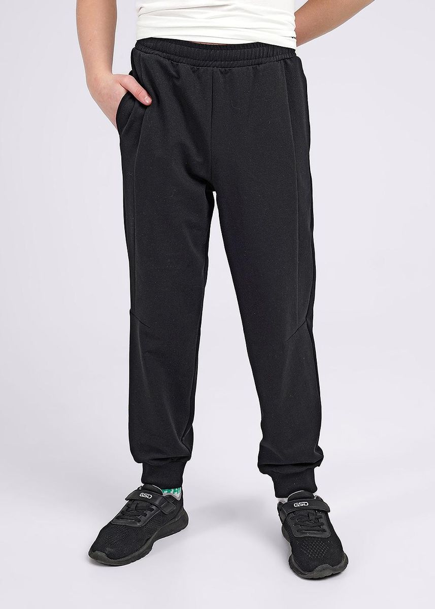 Брюки детские из полотна холодок-сетка прямого силуэта. Пояс отрезной, выполнен из основного полотна, с эластичной тесьмой внутри. Внутри пояса брюк вставлен плоский утягивающий шнурок с пластиковым наконечником. На уровне бедер выполнены карманы с прорезной листочкой, вход в карман с замком. По низу изделия цельнокроенные манжеты на резинки.