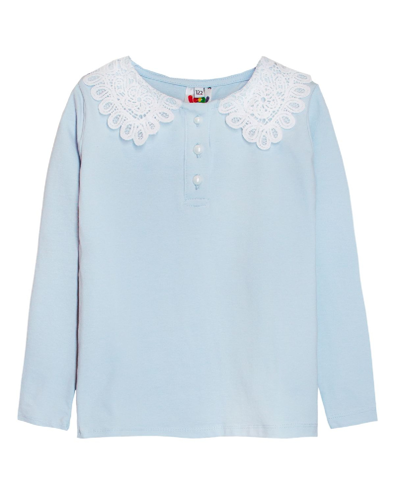 Джемпер для девочки прямого покроя, с втачным длинным рукавом. Горловина круглая, с отложным воротником из кружева. Воротник расположен по полочке, закрепляется в плечевые срезы, кружево в цвет основного полотна. Горловина полочки и спинки внутри обработана настрочной планкой из кулирки. На полочке выполнена планка с 3 пуговицами на ножке и прорезными петлями. Низ изделия и низ рукава обработан швом в подгибку.