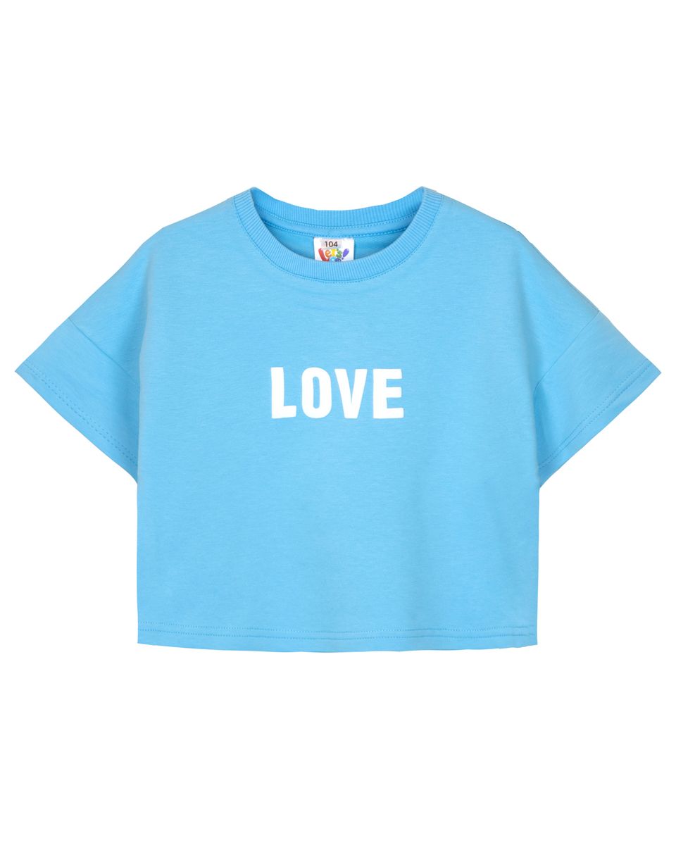 Футболка для девочки прямого силуэта укороченная, со спущенным плечом, коротким рукавом. Горловина круглая, обработана воротником из кашкорсе. Горловина спинки внутри укреплена бейкой из кулирки. Низ изделия и рукавов обработан швом в подгибку. На полочке принт Шелкография со вспенкой. Надпись переводится как "Любовь".