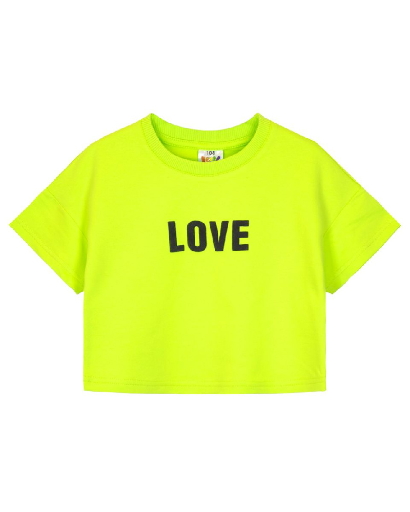 Футболка для девочки прямого силуэта укороченная, со спущенным плечом, коротким рукавом. Горловина круглая, обработана воротником из кашкорсе. Горловина спинки внутри укреплена бейкой из кулирки. Низ изделия и рукавов обработан швом в подгибку. На полочке принт Шелкография со вспенкой. Надпись переводится как "Любовь".