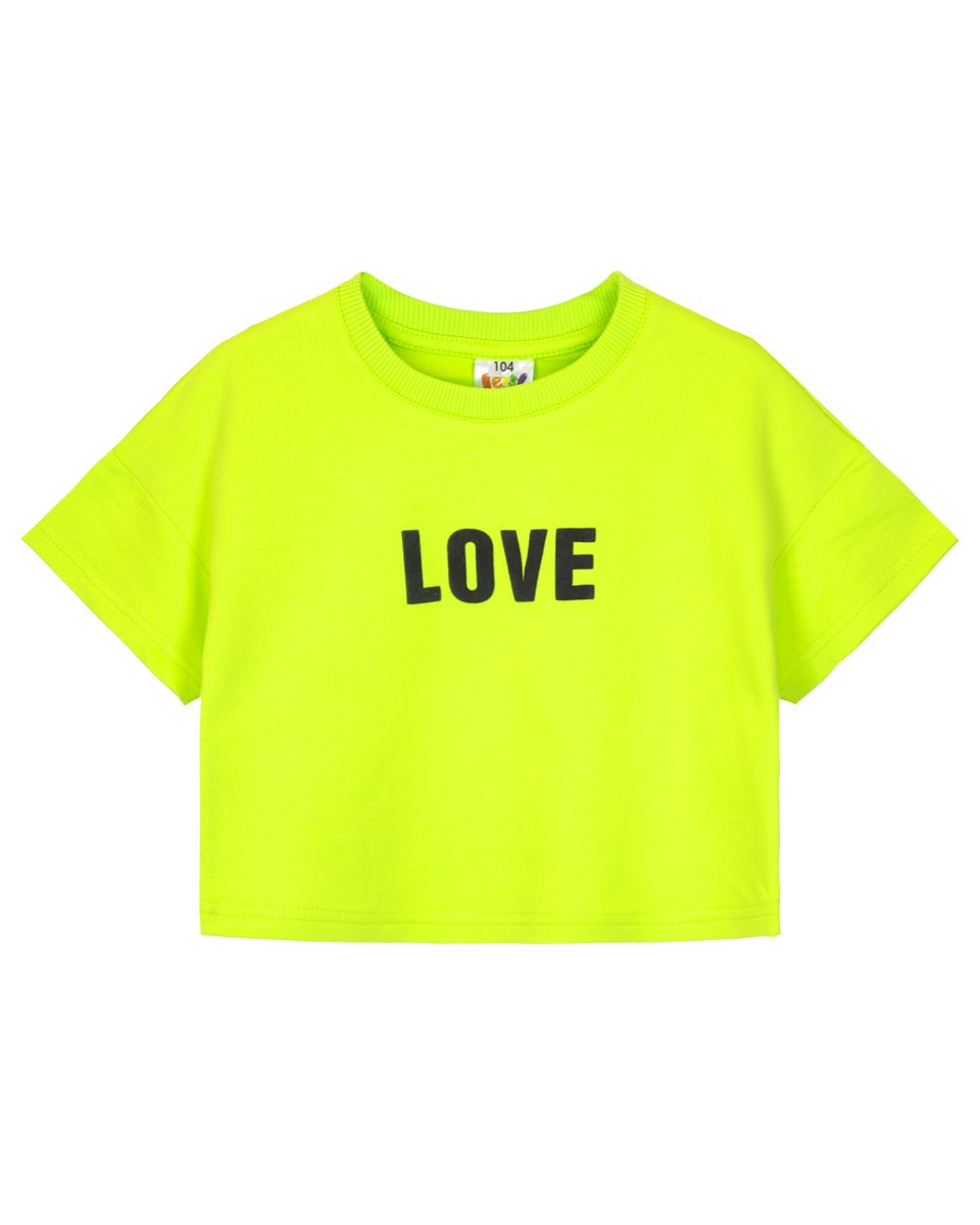 Футболка для девочки прямого силуэта укороченная, со спущенным плечом, коротким рукавом. Горловина круглая, обработана воротником из кашкорсе. Горловина спинки внутри укреплена бейкой из кулирки. Низ изделия и рукавов обработан швом в подгибку. На полочке принт Шелкография со вспенкой. Надпись переводится как "Любовь".