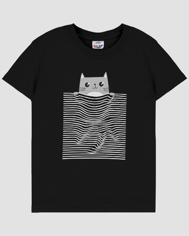 Футболка детская прямого силуэта, с втачным коротким рукавом. Горловина круглая, обработана воротником из рибаны. Горловина спинки внутри укреплена бейкой из кулирки. Низ изделия и рукава обработан швом вподгибку. На полочке принт ШЕЛКОГРАФИЯ.