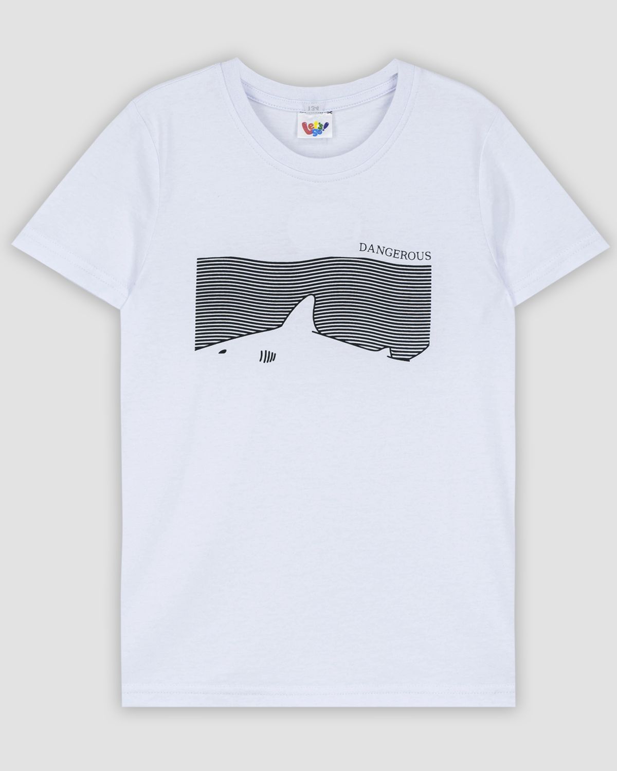Футболка детская прямого силуэта с втачным коротким рукавом. Горловина круглая, обработана воротником из рибаны . Горловина спинки внутри укреплена бейкой из кулирки. Низ изделия и рукава обработан швом вподгибку. На полочке принт ШЕЛКОГРАФИЯ. Надпись переводится как "Опасный".
