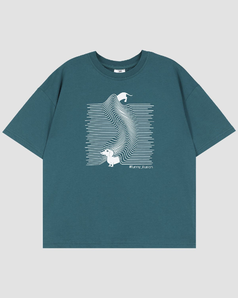 Футболка детская свободного силуэта (оверсайз), с коротким рукавом. Горловина круглая, обработана воротником из рибаны. Горловина спинки внутри укреплена бейкой из кулирки. Низ изделия и рукава обработан швом вподгибку. На полочке принт ШЕЛКОГРАФИЯ. Надпись переводится как "#забавная_иллюзия".