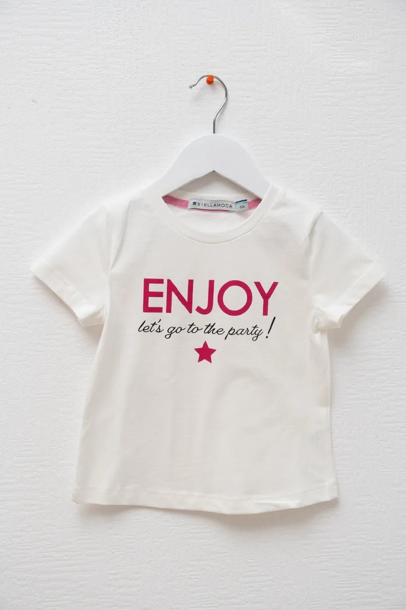 Футболка детская прямого силуэта, с втачным коротким рукавом. Горловина круглая, обработана воротником из кулирки, в цвет изделия. Горловина спинки внутри обработана настрочной планкой из киперной ленты. Низ рукавов обработан швом вподгибку. На передней полочке принт