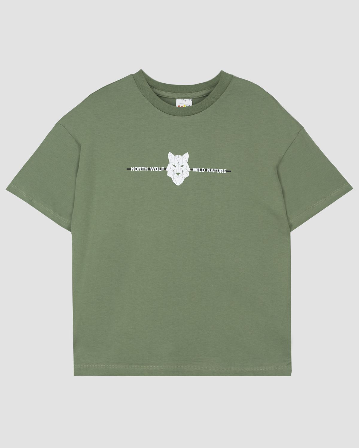 Футболка для мальчика прямого силуэта, со спущенным плечом коротким рукавом. Горловина круглая, обработана воротником из рибаны. Горловина спинки внутри укреплена бейкой из кулирки. По горловине полочки отделочная строчка. Низ изделия и рукавов обработан швом в подгибку. На полочке принт ШЕЛКОГРАФИЯ. Надпись переводится как "Северный волк; Дикая природа".