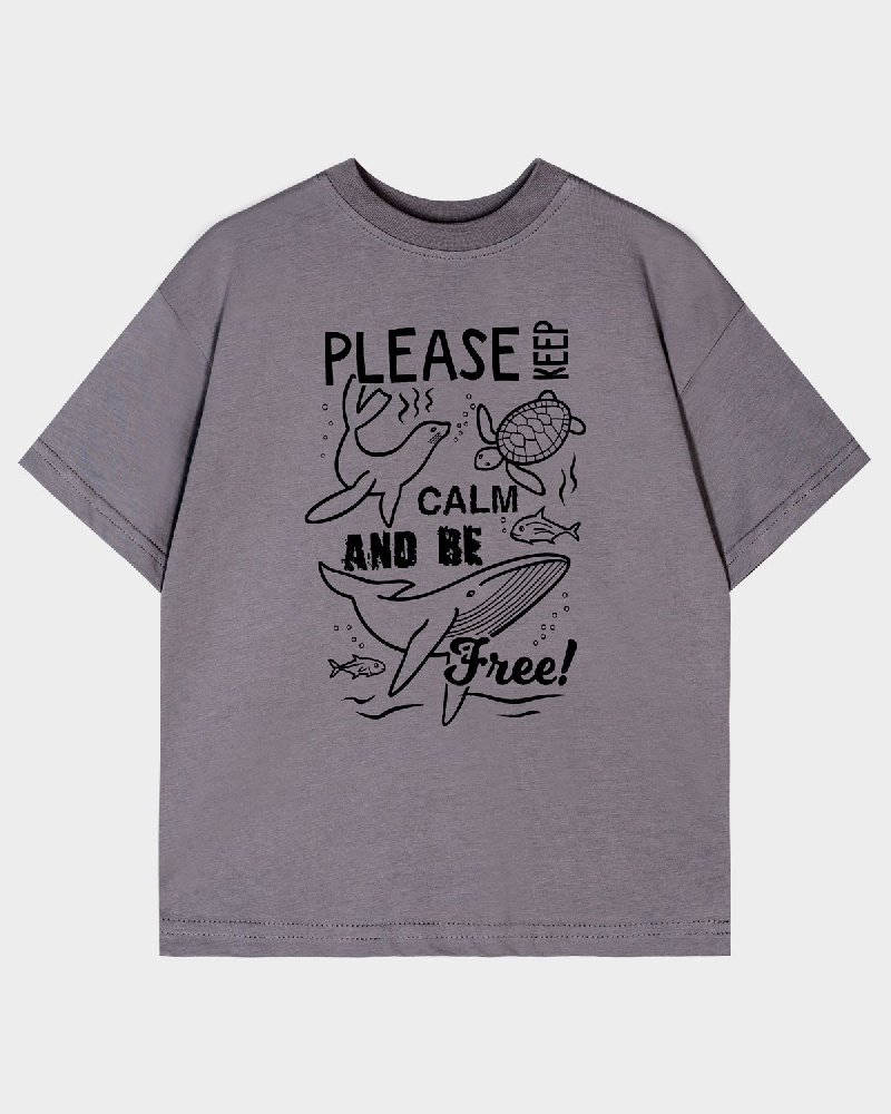 Футболка для мальчика свободного силуэта (оверсайз) с коротким рукавом. Горловина круглая, обработана обтачкой горловиной из рибаны. Низ изделия и рукава обработаны швом вподгибку. На полочке принт Шелкография. Надпись переводится как "Пожалуйста, сохраняйте спокойствие и будьте свободны!".