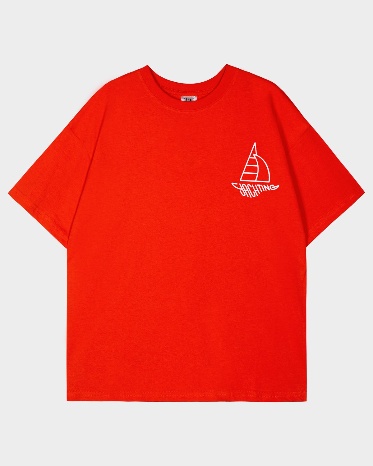 Футболка для мальчика свободного силуэта (оверсайз) с коротким рукавом. Горловина круглая, обработана обтачкой горловиной из рибаны. Низ изделия и рукава обработаны швом вподгибку. На полочке принт Шелкография. Надпись переводится как "Яхтинг".