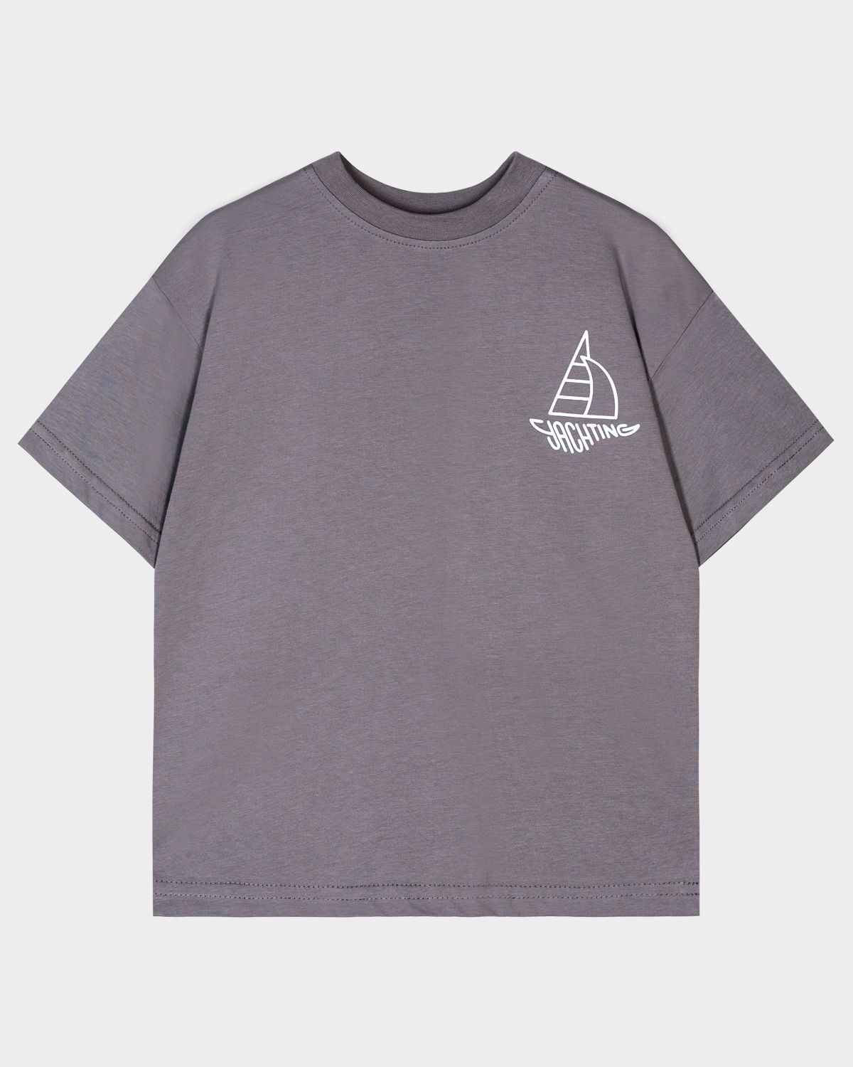 Футболка для мальчика свободного силуэта (оверсайз) с коротким рукавом. Горловина круглая, обработана обтачкой горловиной из рибаны. Низ изделия и рукава обработаны швом вподгибку. На полочке принт Шелкография. Надпись переводится как "Яхтинг".