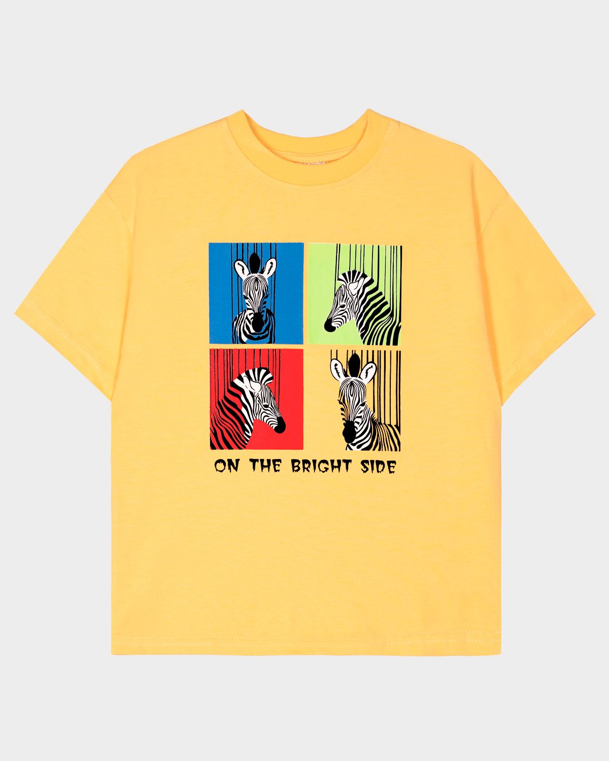 Футболка для мальчика свободного силуэта (оверсайз) с коротким рукавом. Горловина круглая, обработана обтачкой горловиной из рибаны. Низ изделия и рукава обработаны швом вподгибку. На полочке принт Шелкография. Надпись переводится как "На светлой стороне".