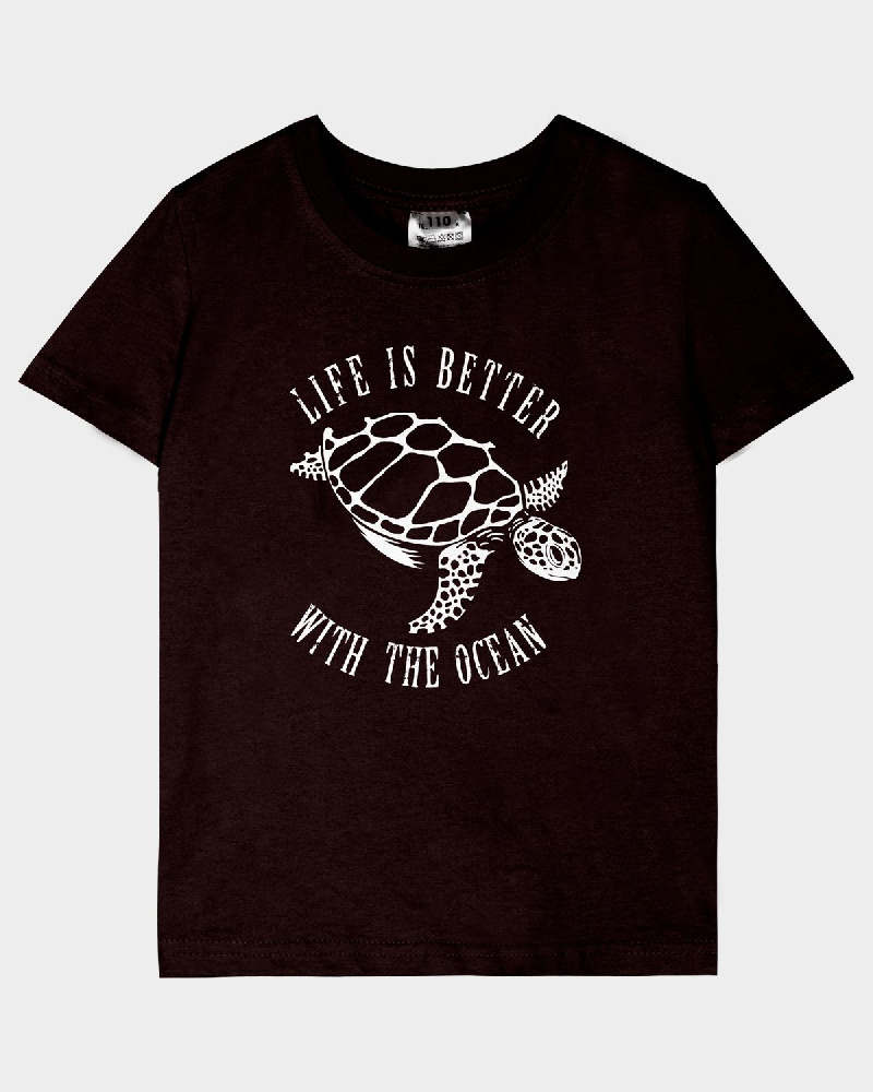 Футболка для мальчика прямого силуэта, с втачным коротким рукавом. Горловина круглая, обработана обтачкой из рибаны. Низ изделия и рукава обработан швом вподгибку. На полочке принт Шелкография. Надпись переводится как "Жизнь лучше с океаном".