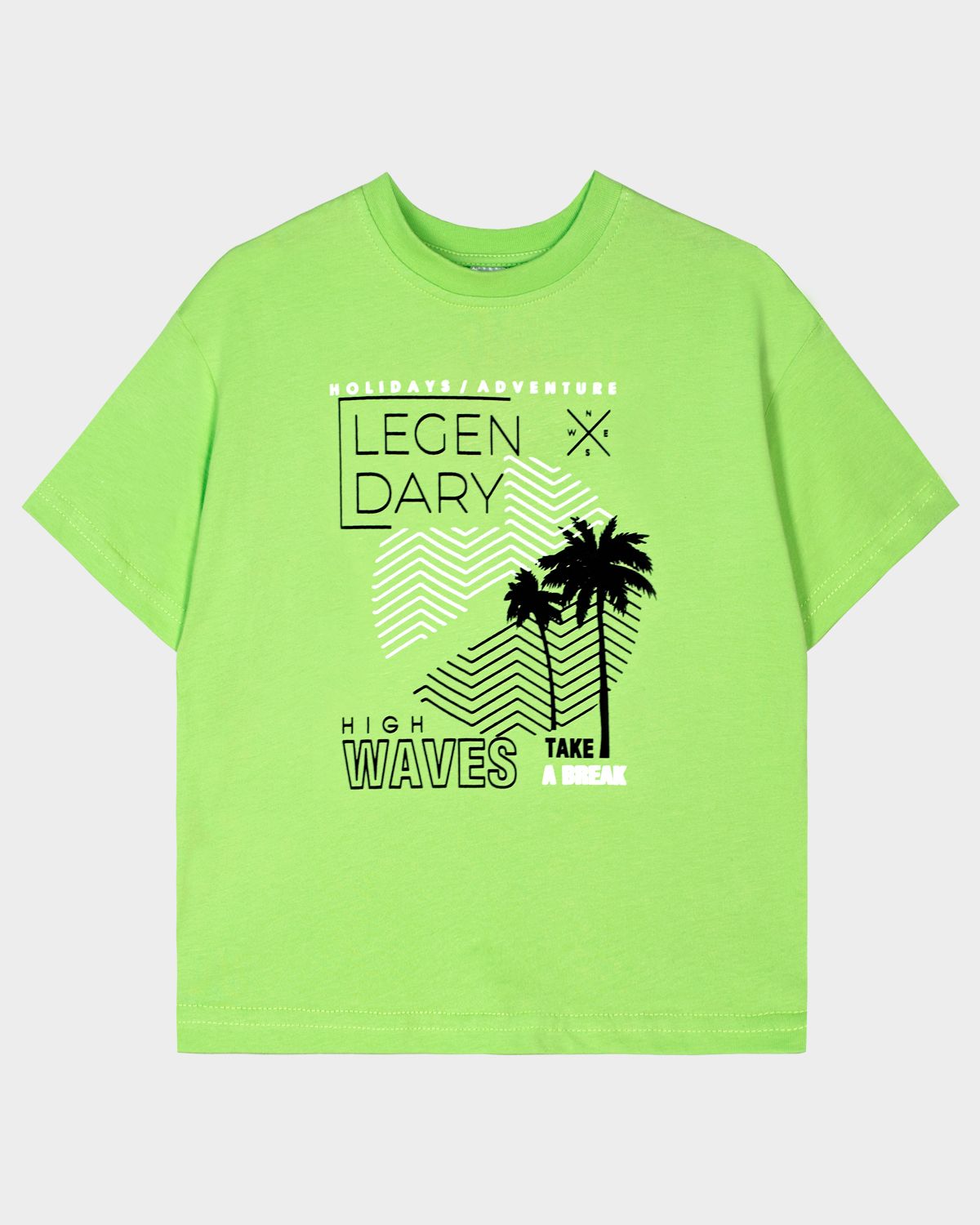 Футболка для мальчика свободного силуэта (оверсайз) с коротким рукавом. Горловина круглая, обработана обтачкой горловиной из рибаны. Низ изделия и рукава обработаны швом вподгибку. На полочке принт Шелкография. Надпись переводится как "Праздники, приключения;Легендарный день;Высокие волны;Сделайте перерыв".