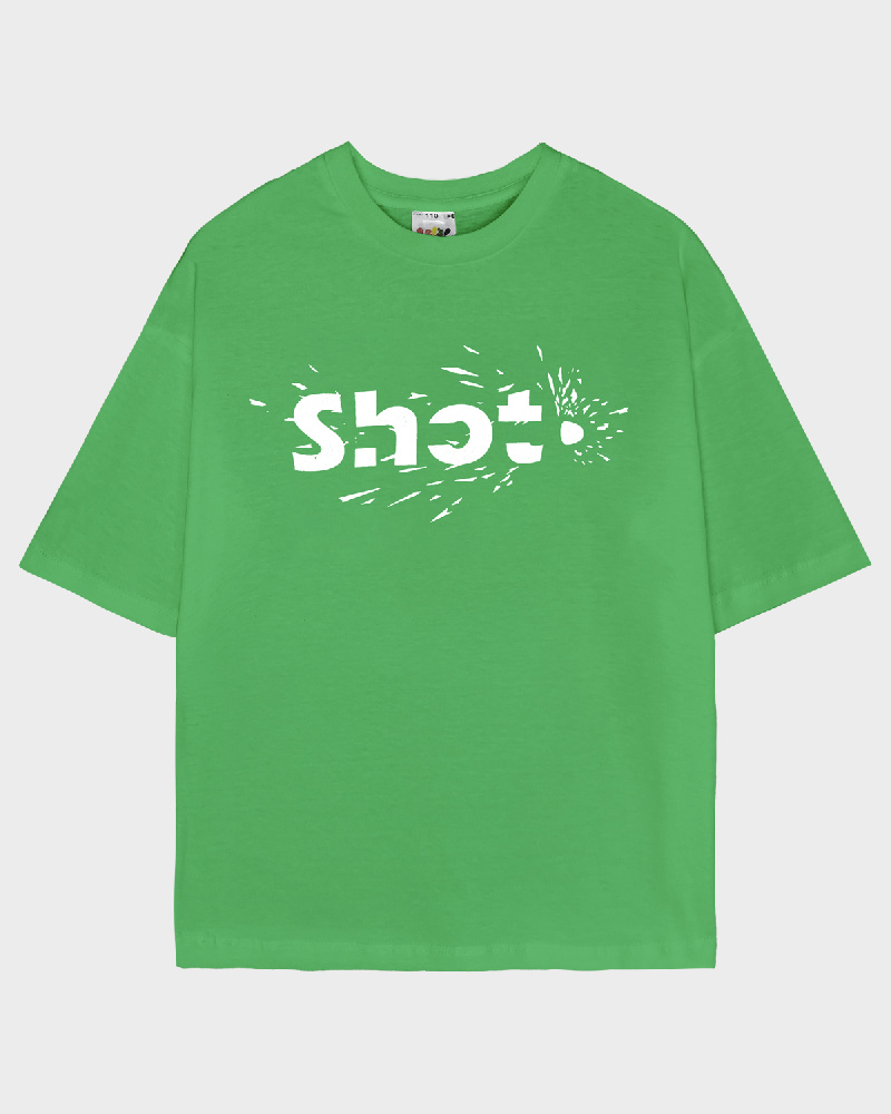 Футболка для мальчика свободного силуэта (оверсайз) с коротким рукавом. Горловина круглая, обработана обтачкой из рибаны. Низ изделия и рукава обработаны швом вподгибку. На полочке принт Шелкография. Надпись переводится как "Выстрел".
