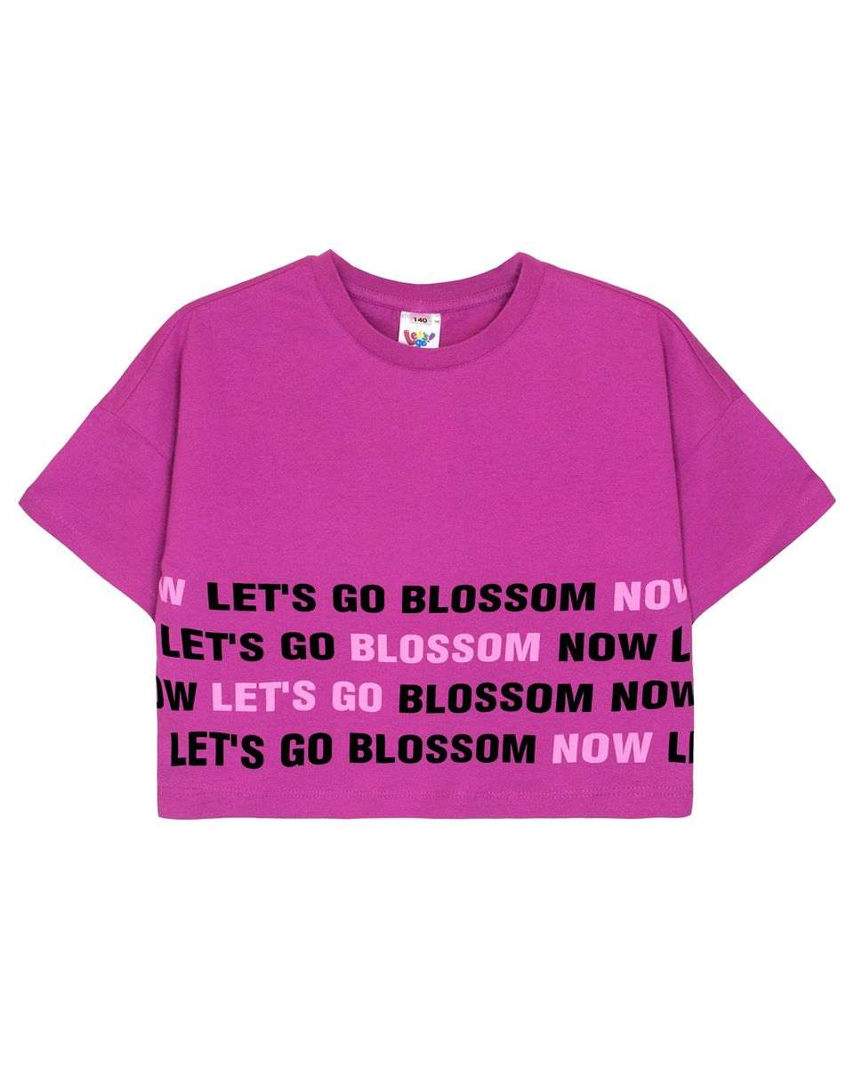Футболка для девочки прямого силуэта укороченная, со спущенным плечом, коротким рукавом. Горловина круглая, обработана воротником из рибаны. Горловина спинки внутри укреплена бейкой из кулирки. По горловине полочки отделочная строчка. Низ изделия и рукавов обработан швом в подгибку. На полочке принт Шелкография. Надпись переводится как "Давай расцветай сейчас".