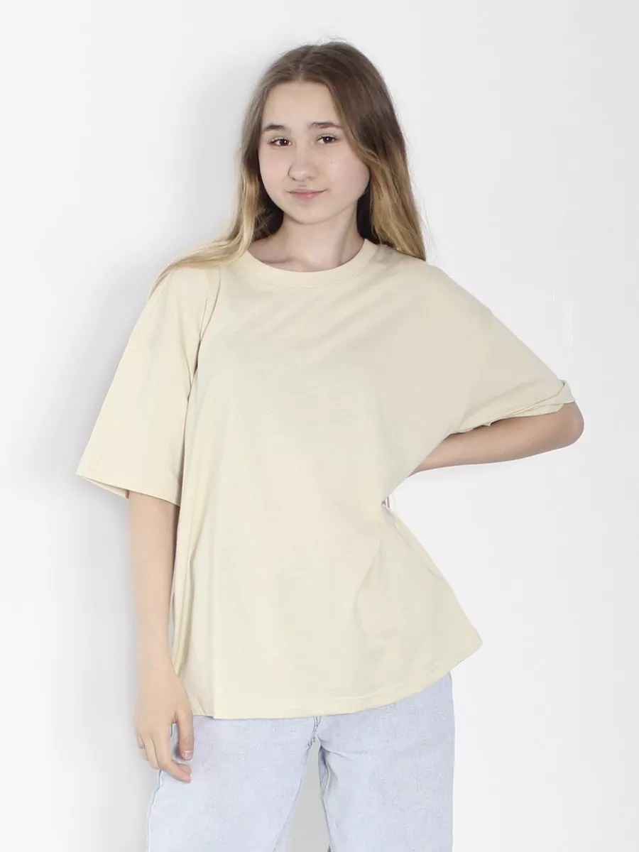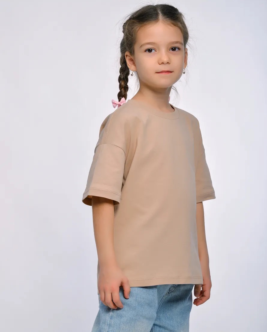 Футболка детская прямого силуэта, крой оверсайз с втачным коротким рукавом. Горловина круглая, обработана воротником из кулирки, в цвет изделия. Горловина спинки внутри обработана настрочной планкой из киперной ленты. Низ рукавов обработан швом вподгибку.