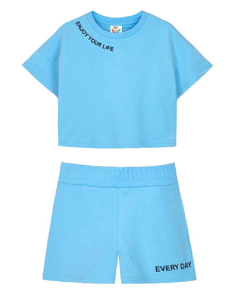 Комплект для девочки состоящий из футболки укороченной и шорт. Футболка для девочки прямого силуэта укороченная, со спущенным плечом коротким рукавом. Горловина круглая, обработана воротником из кашкорсе. Горловина спинки внутри укреплена бейкой из кулирки. На полочке принт Шелкография. Шорты для девочки трапецевидного силуэта. Пояс отрезной выполнен из основного полотна в цвет изделия, с эластичной тесьмой внутри. В боковых швах выполнены карманы с листочкой. Низ изделия обработан швом в подгибку. На левой передней половинке шорт принт Шелкография. Надпись переводится как "Наслаждайся своей жизнью; Каждый день".