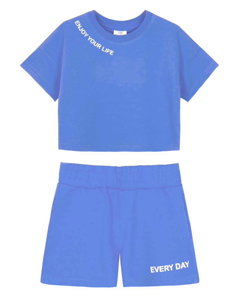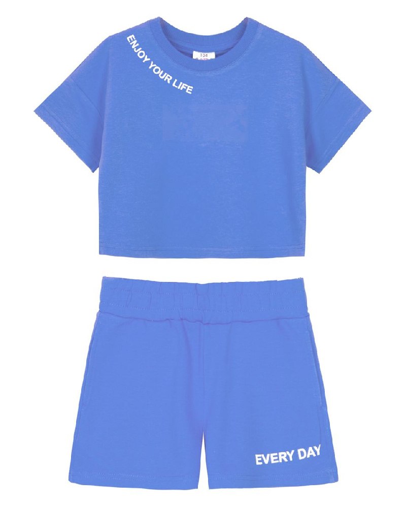 Комплект для девочки состоящий из футболки укороченной и шорт. Футболка для девочки прямого силуэта укороченная, со спущенным плечом коротким рукавом. Горловина круглая, обработана воротником из кашкорсе. Горловина спинки внутри укреплена бейкой из кулирки. На полочке принт Шелкография. Шорты для девочки трапецевидного силуэта. Пояс отрезной выполнен из основного полотна в цвет изделия, с эластичной тесьмой внутри. В боковых швах выполнены карманы с листочкой. Низ изделия обработан швом в подгибку. На левой передней половинке шорт принт Шелкография. Надпись переводится как "Наслаждайся своей жизнью; Каждый день".