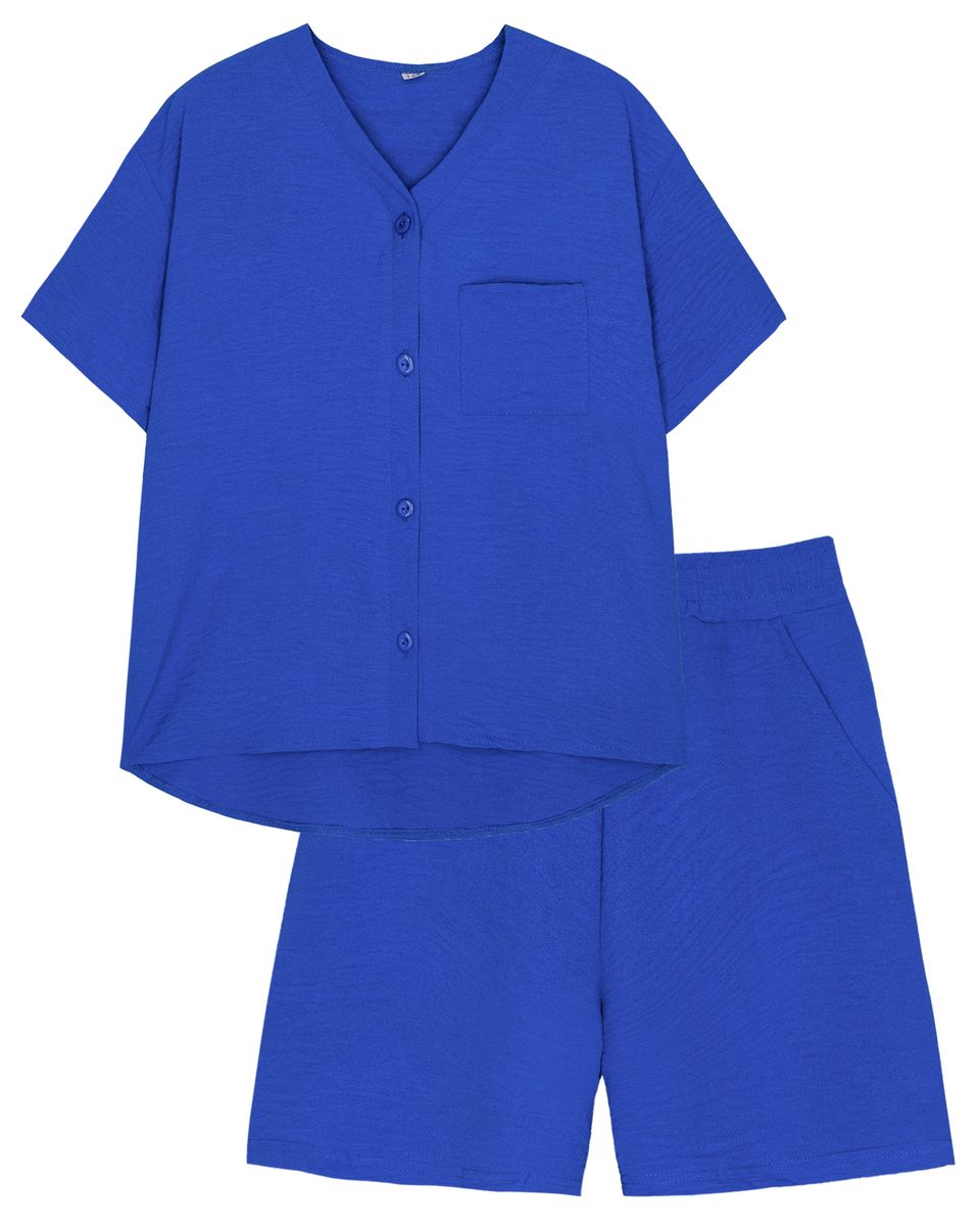 Комплект для девочки. Рубашка для девочки, прямого силуэта, умеренного обьема, центральная застежка на пуговицах, втачная стойка, плечо удлинено, рубашечный короткий рукав,спинка цельная удлинена , на левой полочке расположен квадратный накладной карман, низ изделия фигурный. Шорты для девочки, удлиненные, прямого силуэта. Отрезной пояс, из основного полотна, с эластичной тесьмой внутри. На передней половинке шорт карманы с отрезным бочком. Низ изделия обработан швом в подгибку.
