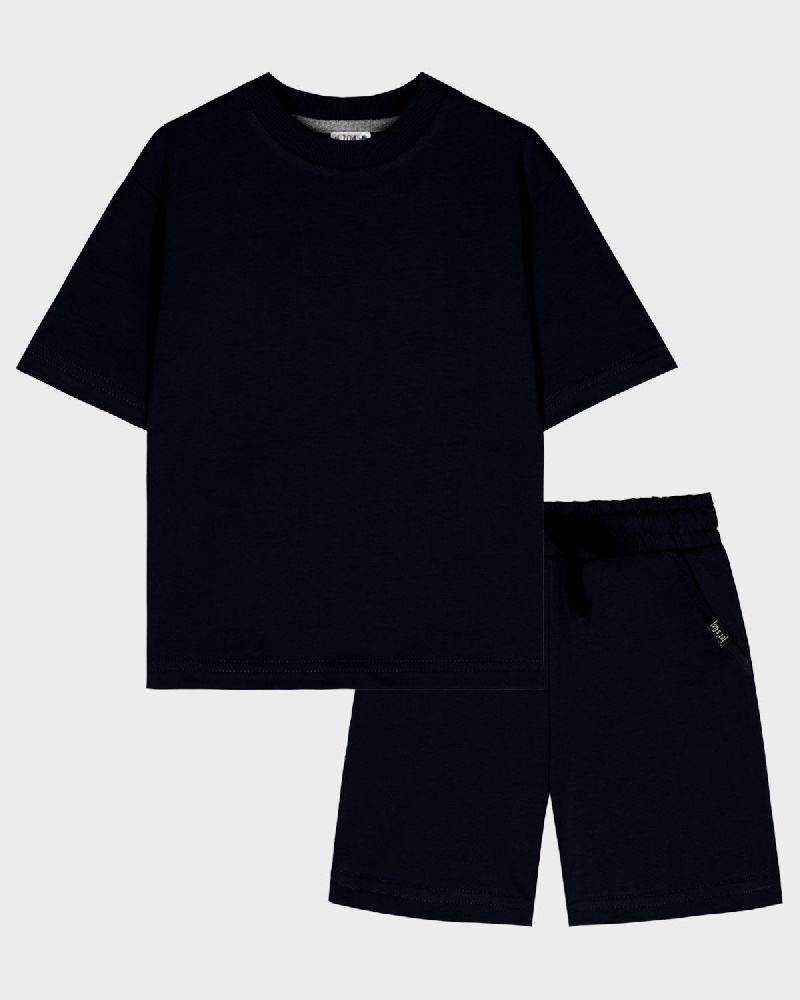Комплект детский, состоящий из футболки и шорт. Футболка свободного силуэта (оверсайз) с коротким рукавом.Горловина круглая, обработана воротником из основного полотна. Низ изделия и рукава обработан швом вподгибку. Шорты прямого силуэта. Пояс отрезной в цвет изделия с эластичной тесьмой внутри. По поясу шорт вставлен плоский утягивающий шнурок, в цвет шорт.На передней половинке шорт карманы с отрезным бочком, вход карман обработан строчкой. На левом кармане вшивной элемент, закрепленный отстрочкой. Низ изделия обработан швом вподгибку.