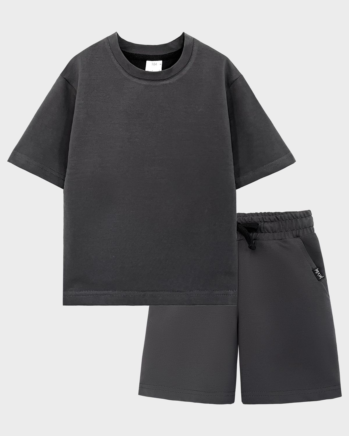 Комплект детский, состоящий из футболки и шорт. Футболка свободного силуэта (оверсайз) с коротким рукавом.Горловина круглая, обработана воротником из основного полотна. Низ изделия и рукава обработан швом вподгибку. Шорты прямого силуэта. Пояс отрезной в цвет изделия с эластичной тесьмой внутри. По поясу шорт вставлен плоский утягивающий шнурок, в цвет шорт.На передней половинке шорт карманы с отрезным бочком, вход карман обработан строчкой. На левом кармане вшивной элемент, закрепленный отстрочкой. Низ изделия обработан швом вподгибку.