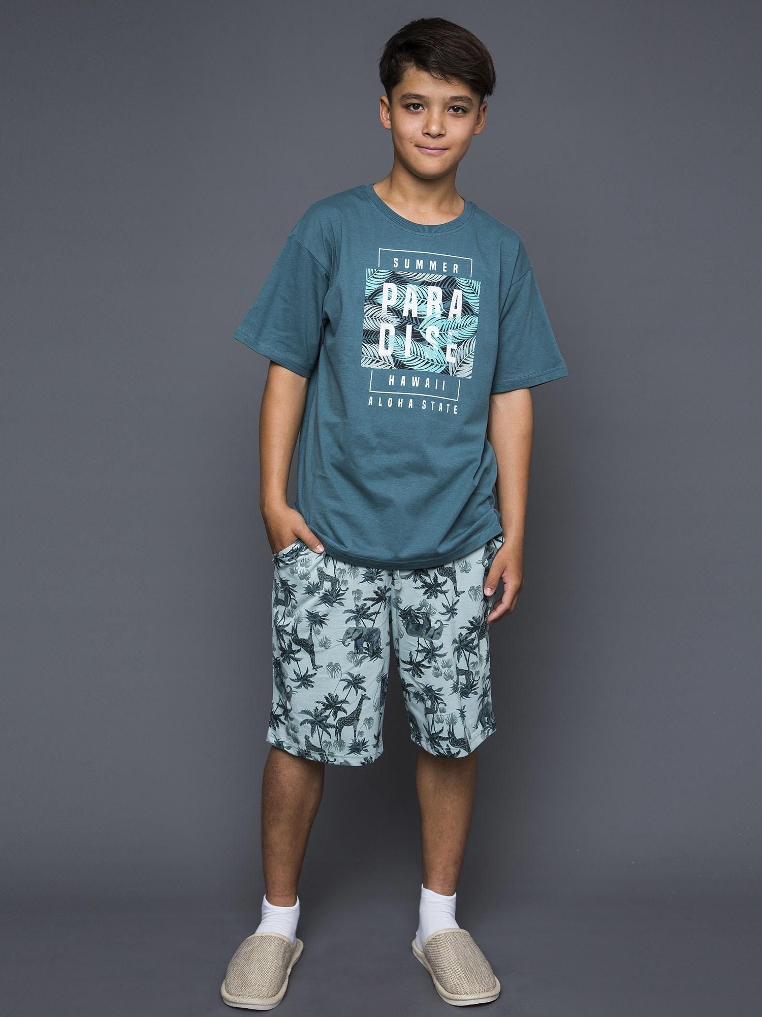 Комплект для мальчика, состоящий из футболки и шорт. Футболка прямого силуэта, с втачным коротким рукавом. Горловина круглая, обработана обтачкой из рибаны. Низ изделия и рукава обработан швом вподгибку. На полочке принт Шелкография. Надпись переводится как "Приключение;Лови волну и наслаждайся". Шорты прямого силуэта. Пояс отрезной выполнен из основного полотна, с эластичной тесьмой внутри. По поясу шорт вставлен плоский утягивающий шнурок. На передних половинках шорт выполнены карманы с отрезным бочком. Низ изделия обработан швом вподгибку.