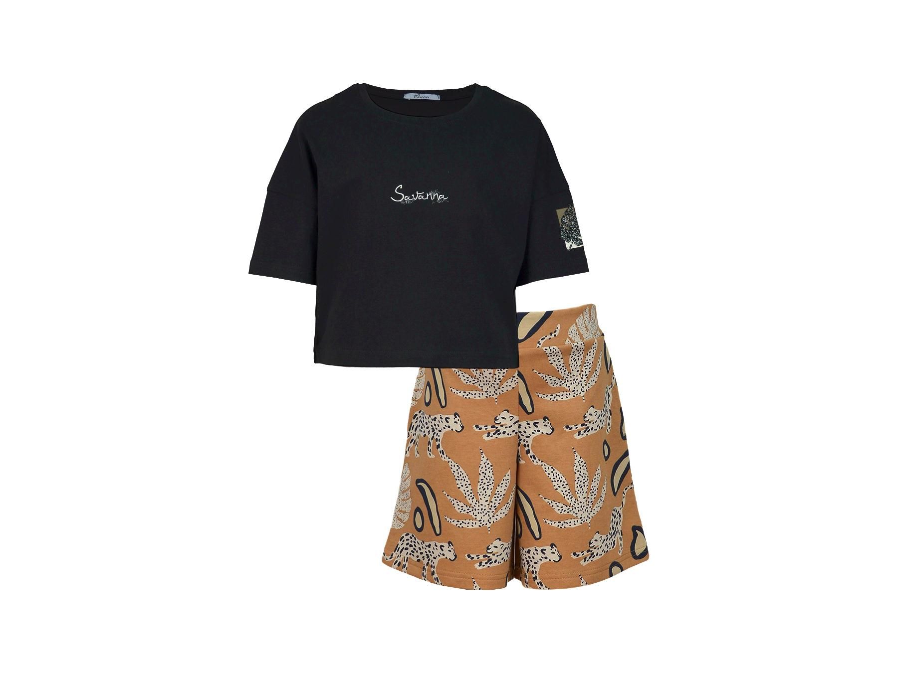 Комплект для девочки, состоящий из футболки и шорт. Футболка для девочки прямого силуэта с втачным коротким рукавом. Горловина круглая обработана воротником из рибаны. На полочке принт шелкография. Надпись переводится как "Хорошего дня". Шорты для девочки прямого силуэта. Цельнокроенный пояс, с эластичной тесьмой внутри. Низ изделия обработан швом в подгибку.