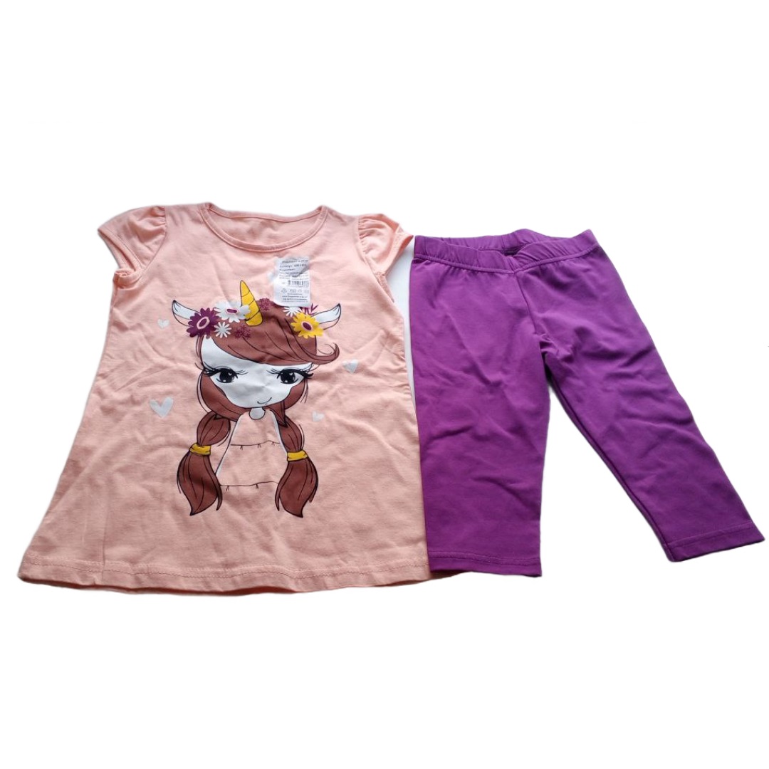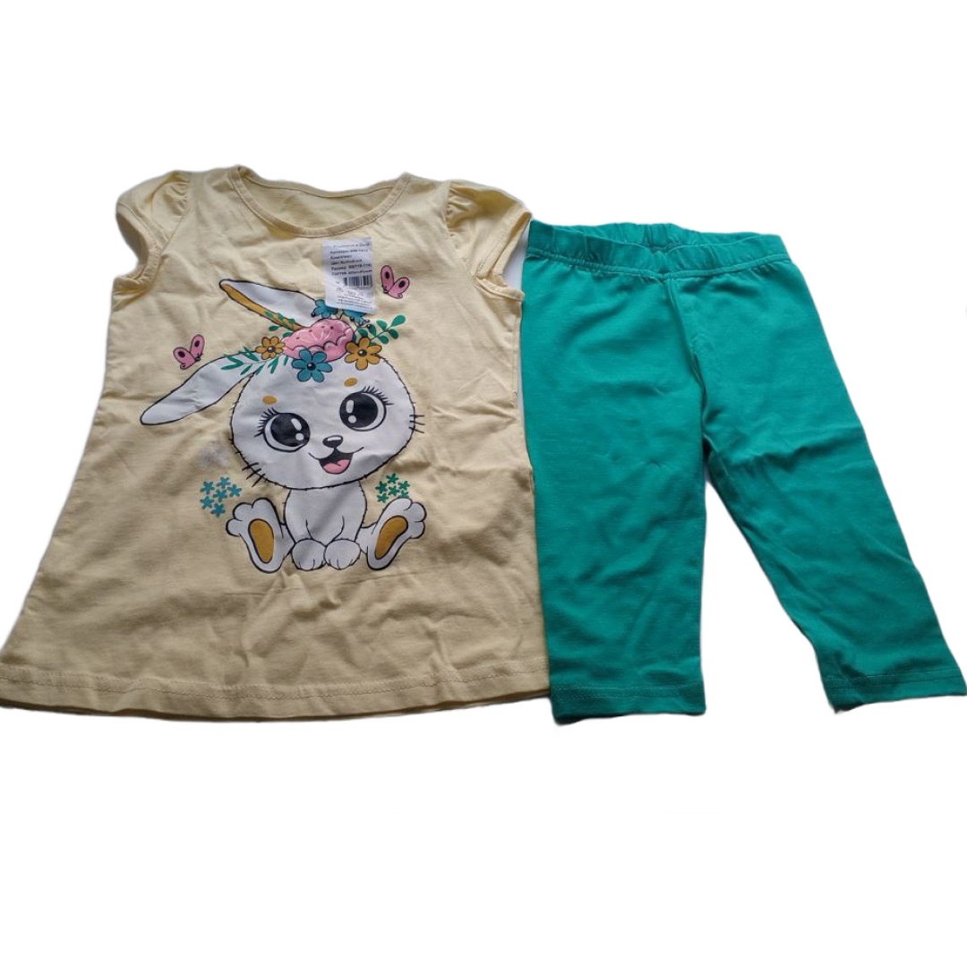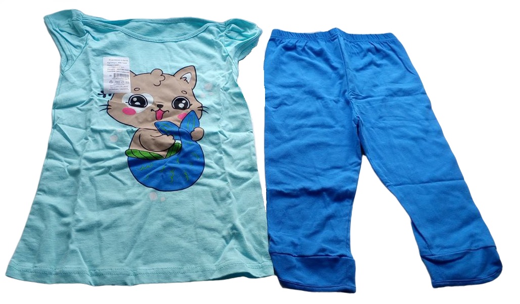 Комплект одежды для девочки бренда "Ивашка" оптом. Костюм из двух видов ткани. Укороченная футболка прилегающего силуэта из хлопка с добавлением лайкры. Рукав втачной, короткий. Горловина отделана узкой обтачкой, полочка украшена шелкографией. Брюки просторные с высокой посадкой, на широком поясе с боковой вставкой. Выполнены из прочной ткани с добавлением эластана.
