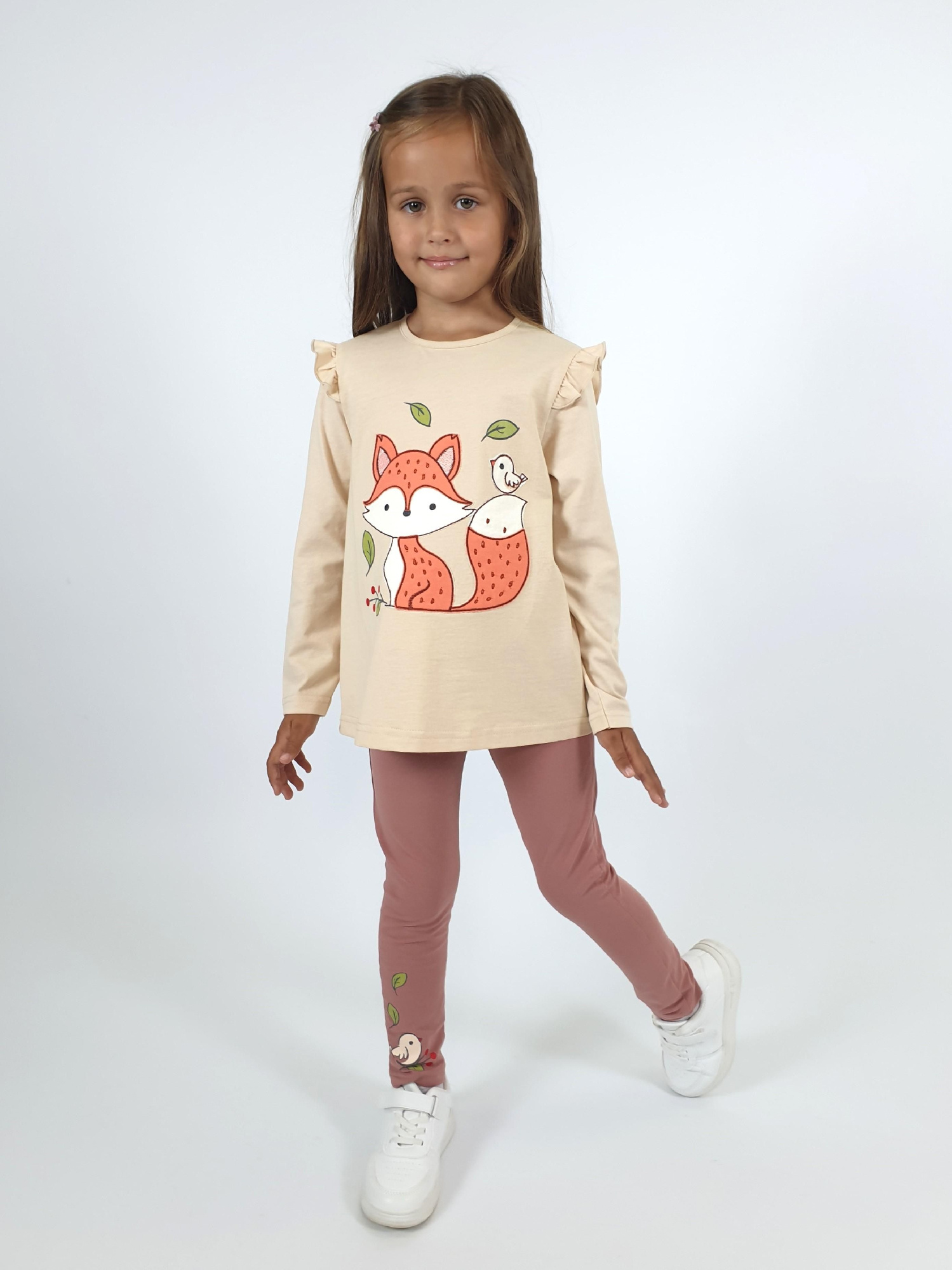 Комплект одежды для девочки бренда "Ивашка" оптом. Костюм из мягкого вафельного трикотажа. Свитшот свободного кроя, круглый вырез горловины, спущенные рукава с манжетами. Свободные шорты с имитацией гульфика.