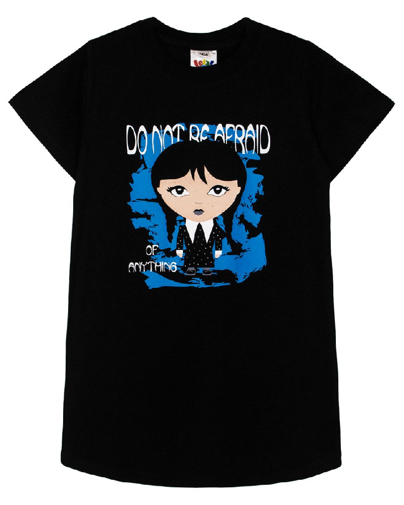 Платье для девочки прямого силуэта, с втачным коротким рукавом. Горловина круглая, обработана воротником из рибаны. Горловина спинки внутри укреплена бейкой из кулирки. По горловине полочки отделочная строчка. Низ изделия и низ рукавов обработан швом в подгибку. На полочке принт шелкография. Надпись переводится как "Ничего не бойся".