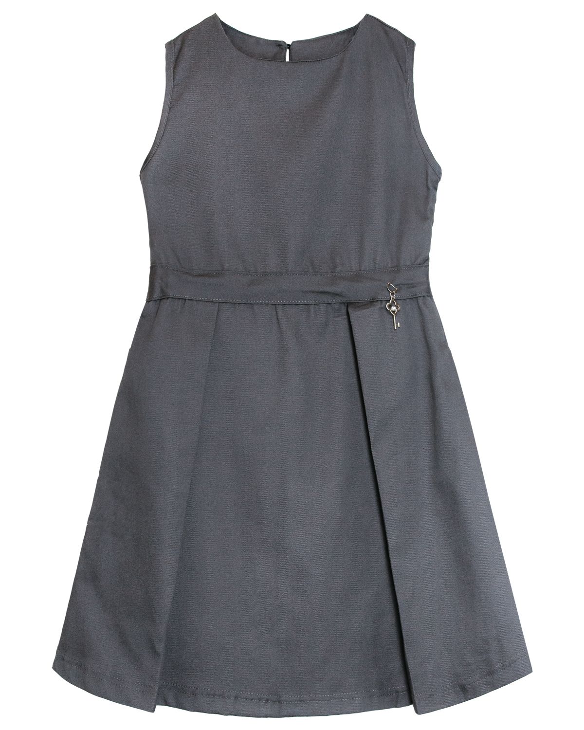 Сарафан для девочки приталенного силуэта. Горловина круглая, на полочки и спинки внутри обработана обтачкой из основного полотна. Обтачки по горловине проклеена дублерином на трикотажной основе. Пояс отрезной с декоративным элементом. Пройма сарафана окантована из основного полотна. По спинке средний шов с вырезом. Застежка - в виде петли на спинке, пуговица на ножке. В левом боковом шве потайной замок, в цвет изделия. Юбка расклешенная, со складками по линии талии. Низ изделия обработан швом в подгибку.