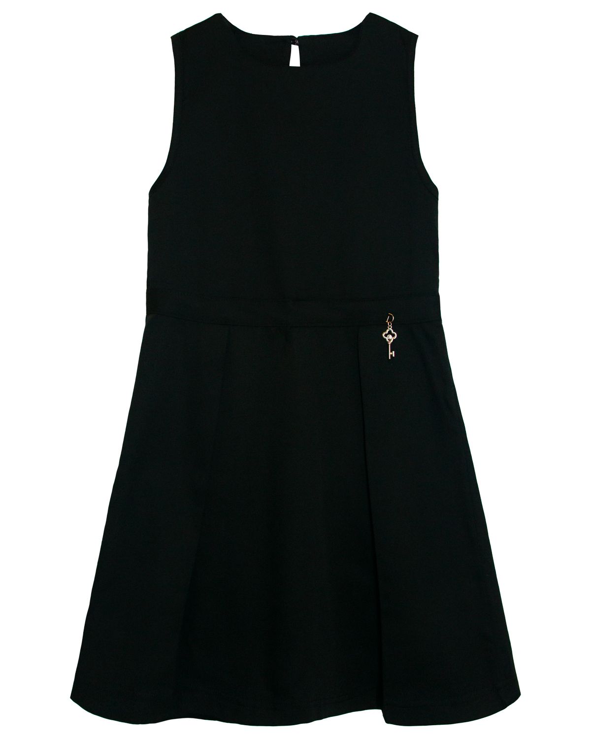 Сарафан для девочки приталенного силуэта. Горловина круглая, на полочки и спинки внутри обработана обтачкой из основного полотна. Обтачки по горловине проклеена дублерином на трикотажной основе. Пояс отрезной с декоративным элементом. Пройма сарафана окантована из основного полотна. По спинке средний шов с вырезом. Застежка - в виде петли на спинке, пуговица на ножке. В левом боковом шве потайной замок, в цвет изделия. Юбка расклешенная, со складками по линии талии. Низ изделия обработан швом в подгибку.