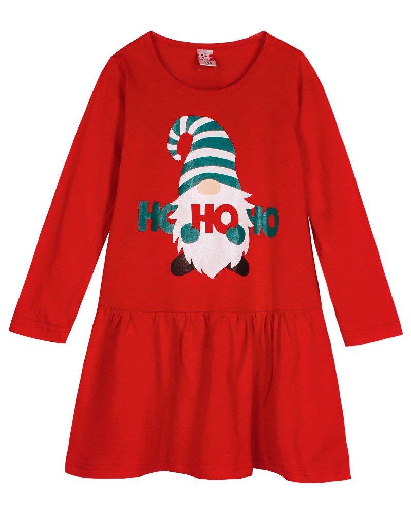 Платье А-силуэта для девочки из гладкокрашенной кулирки. На полочке принт (шелкография). Платье умеренного объема, с воланом со сборкой по низу. У платья длинный втачной рукав. Округлый вырез горловины обработан бейкой из основного полотна.