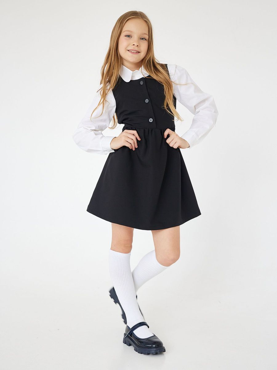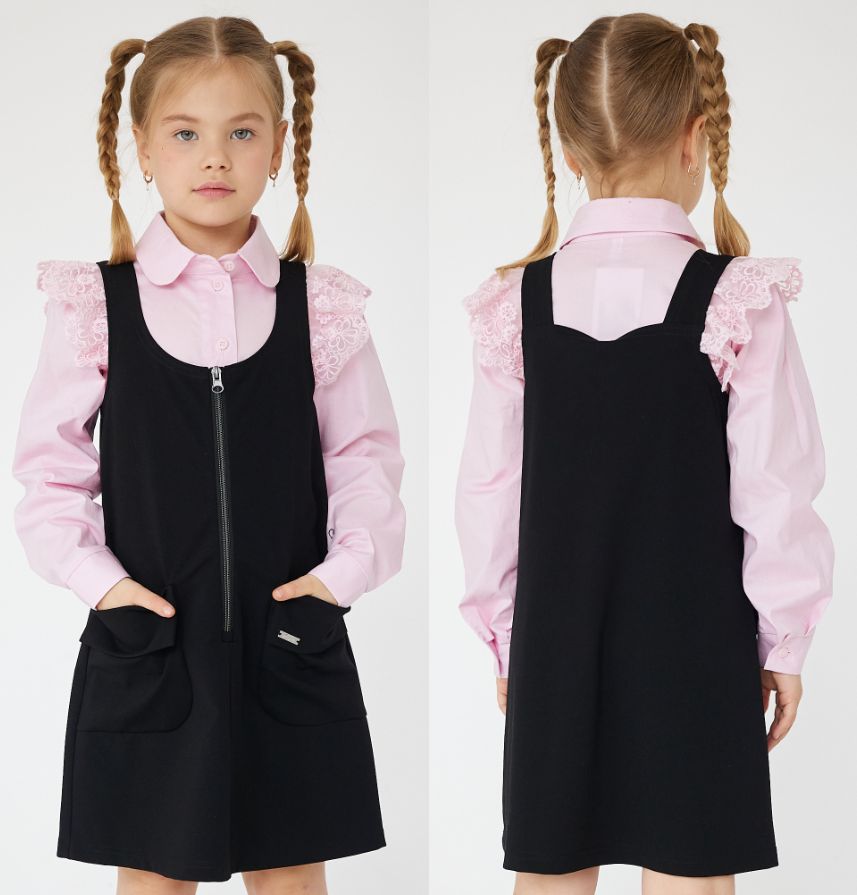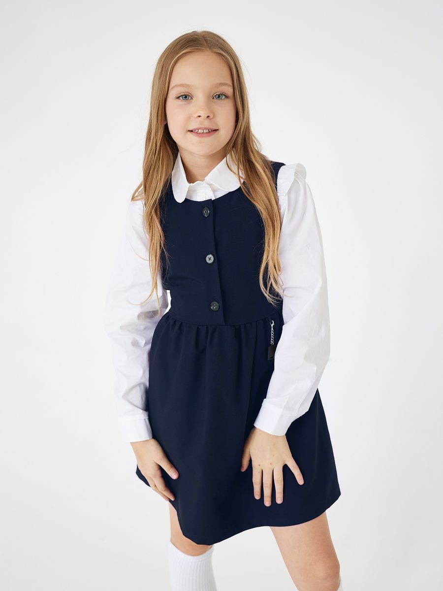 Сарафан для девочки приталенного силуэта. Горловина круглая, на полочки и спинки внутри обработана обтачкой из основного полотна. Обтачки по горловине проклеена дублерином на трикотажной основе. Пояс отрезной с декоративным элементом. Пройма сарафана окантована из основного полотна. По спинке средний шов с вырезом. Застежка - в виде петли на спинке, пуговица на ножке. В левом боковом шве потайной замок, в цвет изделия. Юбка расклешенная, со складками по линии талии. Низ изделия обработан швом в подгибку.